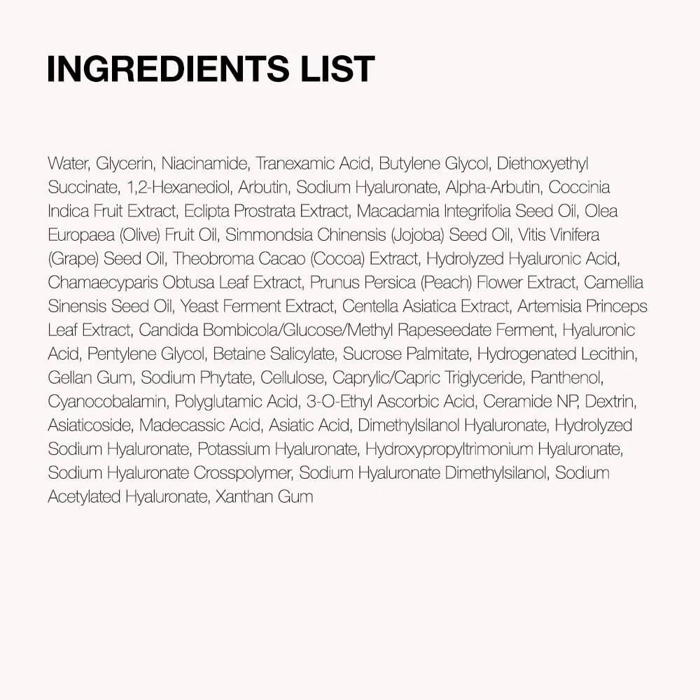 Key Actives: Niacinamide, Tranexamic Acid, Alpha-Arbutin, Hyaluronic Acid (Hydrolyzed, Sodium, Crosspolymer), Vitamin C (3-O-Ethyl Ascorbic Acid), Centella Asiatica Extract, Ceramide NP.