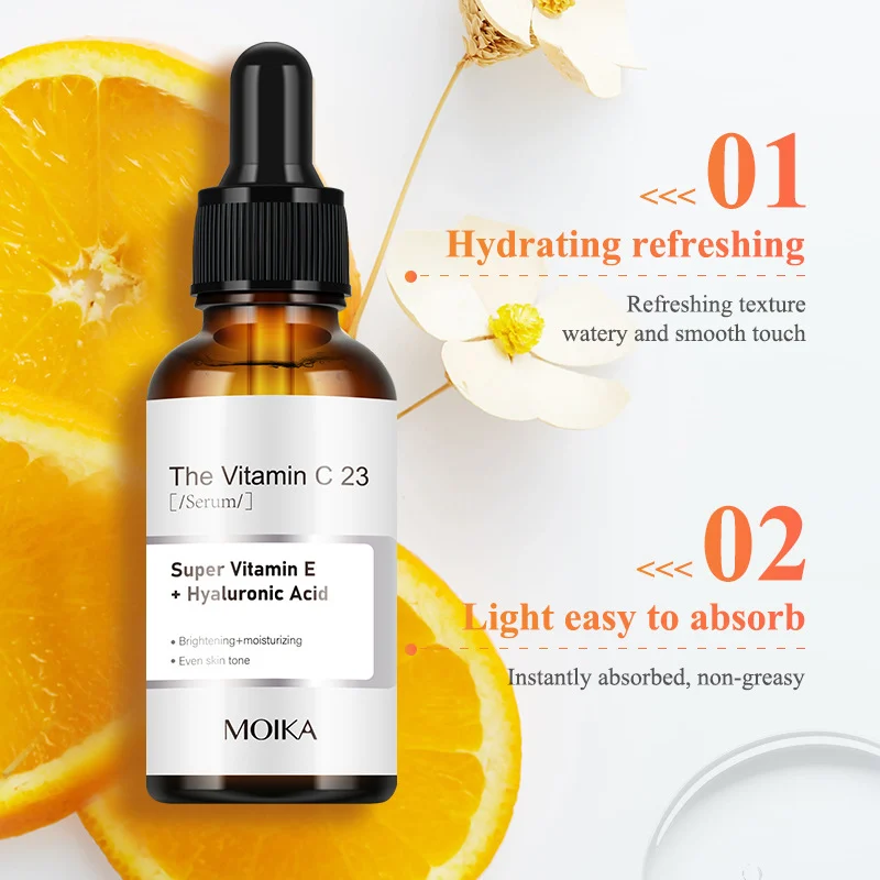 Elevate your skincare routine with the MOIKA Vitamin C 23% Serum. This powerful facial essence is formulated to target multiple signs of aging and fatigue, delivering a potent blend of 23% Vitamin C (Ascorbic Acid), Hyaluronic Acid, and Super Vitamin E. It is designed to rejuvenate your skin, revealing a more youthful, radiant, and hydrated complexion.